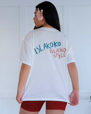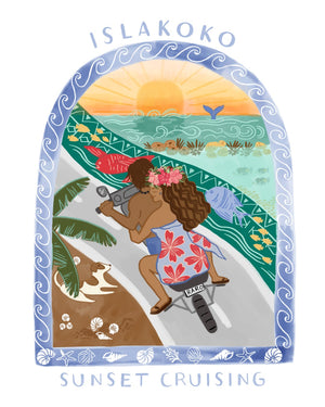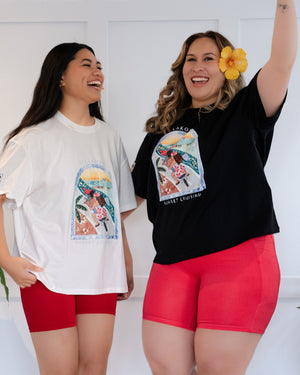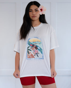 Ride into island time with our ‘Sunset Cruising’ Tee – a tribute to laidback Rarotongan evenings and local love stories on two wheels. Featuring a guy and girl gliding past the iconic Marae Moana seawall mural at golden hour, with the famous little Raro dog Pepe chilling nearby, soaking up the sunset. This oversized tee captures that dreamy Cook Islands magic – salty air, scooter rides, and the kind of tropical freedom that lingers long after the sun dips below the horizon.