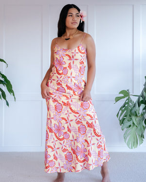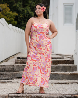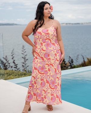 The island-style Amy maxi dress perfectly blends tropical charm and contemporary elegance. This dress features a stunning bias cut silhouette, double lined with built-in slip underneath, delicate adjustable shoestring straps that gracefully accentuate the shoulders, providing a relaxed and comfortable fit ideal for summer evening wear or a stroll through the markets.
