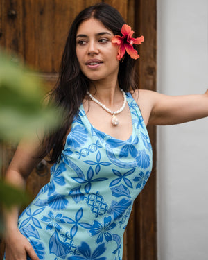 Sophisticated and classy is our glamorous Cynthia Dress. This dress is fully double-lined and sewn on the bias for a flattering shape.A subtle, soft cowl scoop neck giveselegance to this lovely style. The perfect island-style event-ready dress
