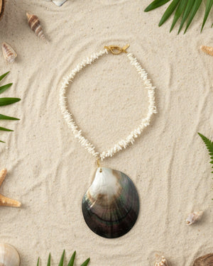 Embrace the tropical spirit of Islakoko with this handcrafted necklace, featuring white Natural Coral Bamboo Beads and a bold Black Mother of Pearl statement shell. Designed for those who love island-inspired style, the white coral evokes sunlit beaches while the deep, iridescent shell reflects the mystery of tropical waters. Finished with a polished gold clasp and Islakoko gold tag, this piece brings a touch of paradise to any outfit - perfect for those who carry elegant tropical vibes wherever they go.